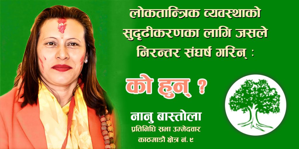 काठमाडौं निर्वाचन क्षेत्र नं ९ अन्तर्गत प्रतिनिधि सभा सदस्यमा नेपाली काङ्ग्रेसको तर्फबाट उम्मेदवार बनेकी नानुमैया बास्तोला लामो समयदेखि लोकतान्त्रिक आन्दोलनमा कृयाशील युवा नेतृ हुन् । २०३७ साल चैत २९ गते जन्मिएकी उनी उदयपुर जिल्लाकी स्थायी बासिन्दा हुन्। बास्तोला काठमाडौं निर्वाचन क्षेत्र नम्बर ९ (क) बाट राजनीतिमा सक्रिय रहँदै आएको देखिन्छ। उनले सो क्षेत्रबाट गत निर्वाचनमा […]