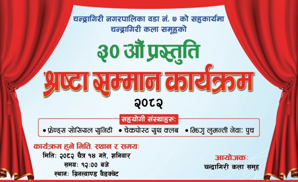 काठमाडाैं । चन्द्रागिरि कला समूहको आयोजना तथा वडा नं ७ को सहकार्यमा विभिन्न क्षेत्रमा योगदान दिएका व्यक्तित्वहरूलाई सम्मान गरिने भएको छ । चन्द्रागिरि नगरपालिकाको वडा नं ७ मा रहेर कला, साहित्य, संस्कृति, सञ्चार, खेलकूद, कलाकारिता तथा समाज सेवाको क्षेत्रमा उल्लेखनीय योगदान पुर्याएका व्यक्तित्वहरूलाई सम्मान गर्न लागेको आयोजक संस्थाका अध्यक्ष श्याम मानन्धरले जानकारी दिएका छन् । […]