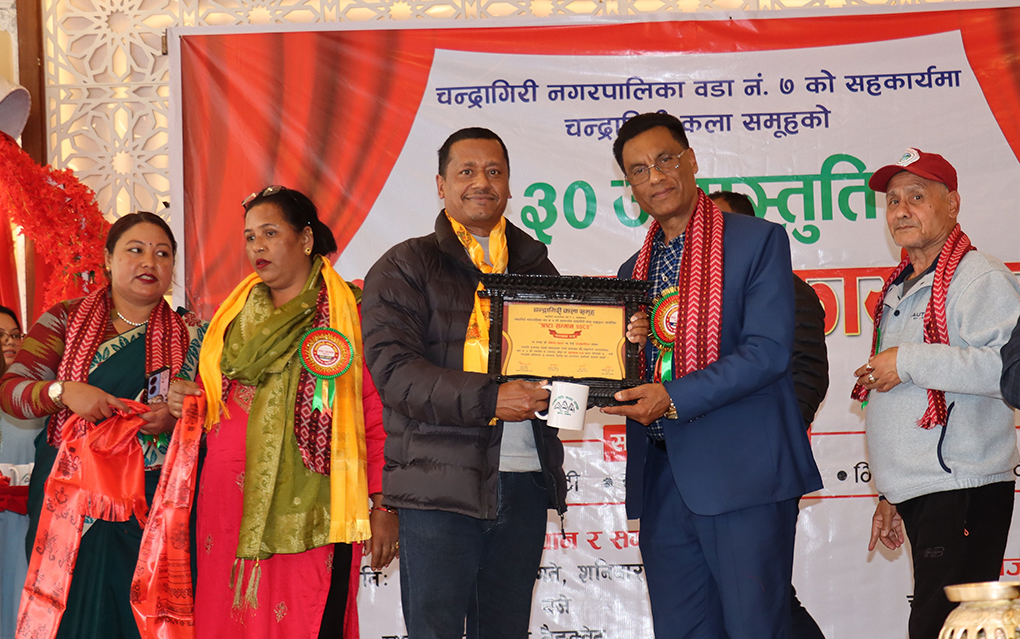 काठमाडौं । चन्द्रागिरि कला समूहको आयोजना तथा वडा नं ७ को सहकार्यमा विभिन्न क्षेत्रमा योगदान दिएका व्यक्तित्वहरूलाई सम्मान गरिएको छ । चन्द्रागिरि नगरपालिकाको वडा नं ७ मा रहेर कला, साहित्य, संस्कृति, सञ्चार, खेलकूद, कलाकारिता तथा समाज सेवाको क्षेत्रमा उल्लेखनीय योगदान पुर्याएका ५१ जना व्यक्तित्वहरूलाई सम्मान गरेको हो । प्रमुख अतिथि घनश्याम गिरीको उपस्थितिमा वडा नं […]