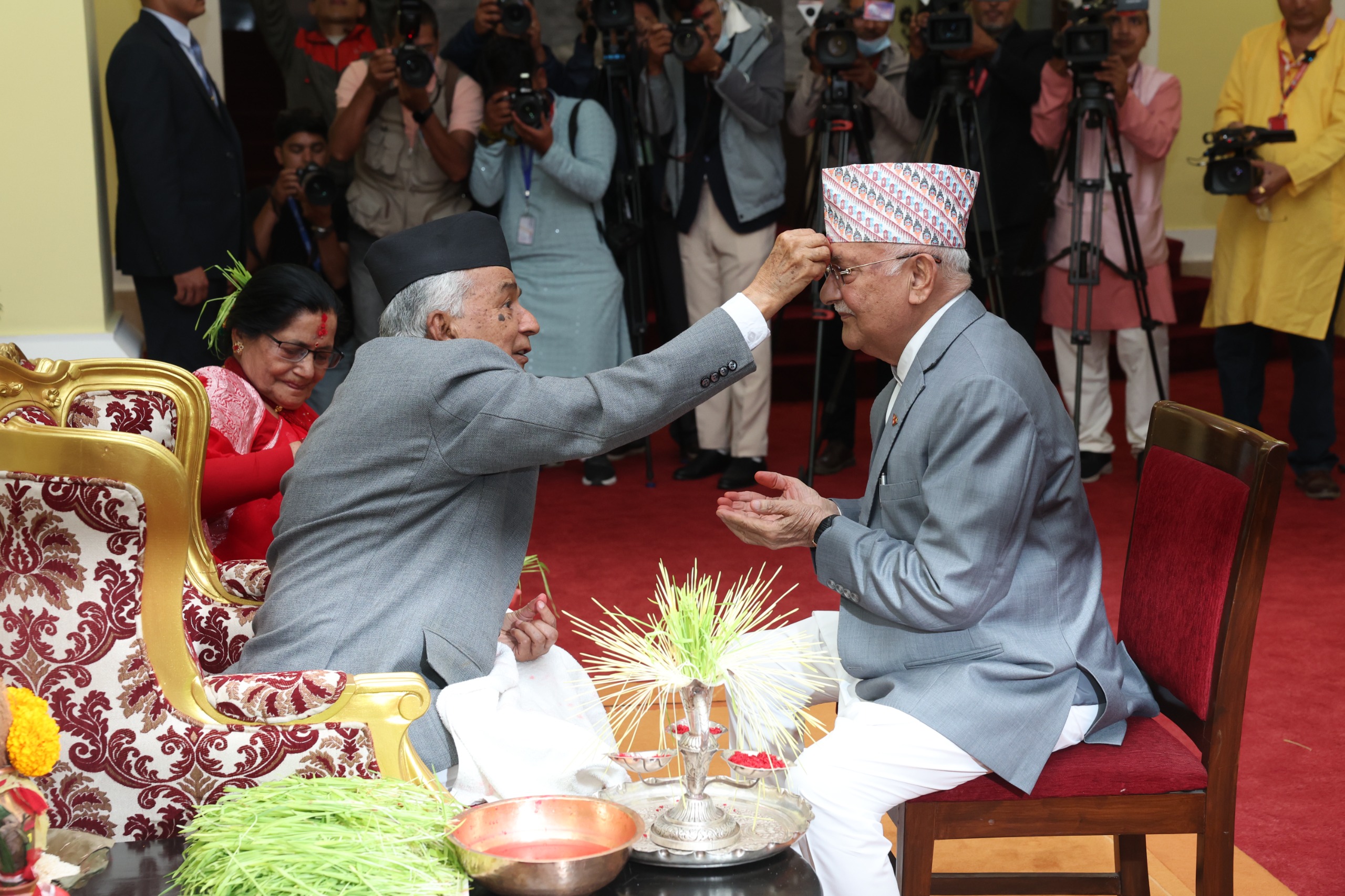 'आज शितल निवासमा प्रधानमन्त्री ओलीद्वारा राष्ट्रपति रामचन्द्र पौडेलको हातबाट टीका ग्रहण गरेका छन् ।'