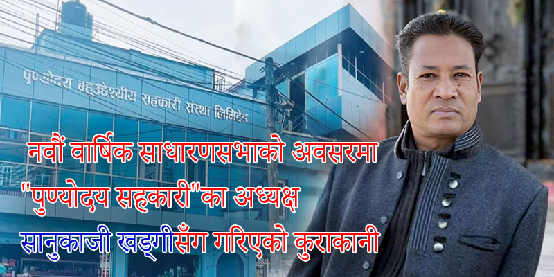 संस्थाको नवौं वार्षिक साधारण सभाको अवसरमा संस्था र सभाबारे केहि कुराहरू राख्ने मौका दिनु भयो त्यसका लागि शोणितपुर खबरलाई धन्यवाद दिन चाहान्छु । साधारण सभा भनेको वर्षभरि संस्थाले गरेको गतिविधि, उन्नति प्रगति, समस्या, सल्लाह, सुझाव सहयोगको सम्बन्धमा व्यापक छलफल गर्ने एउटा प्लेटफर्म हो । संस्थाको संचालक समिति, लेखा समिति, ऋण उप–समिति लगायत विभिन्न उप–समितिहरुको आवश्यकता अनुसारको हेरफेर आदि हुने दिन पनि हो यो साधारण सभा । त्यसकारण संस्थामा आबद्ध सम्पूर्ण सदस्यहरूलाई लगायत संचालक समिति, सल्लाहकारज्यूहरु, लेखा समिति, संस्थाका विभिन्न उप समितिहरूका पदाधिकारीहरू र सम्पुर्ण कर्मचारी मित्रहरूलाई नवौं साधारणसभा मार्फत यस पुण्योदय सहकारीलाई थप व्यवस्थित र प्रभावकारी रूपमा अगाडि बढाउन हातेमालोका लागि अपिल गर्दछु ।