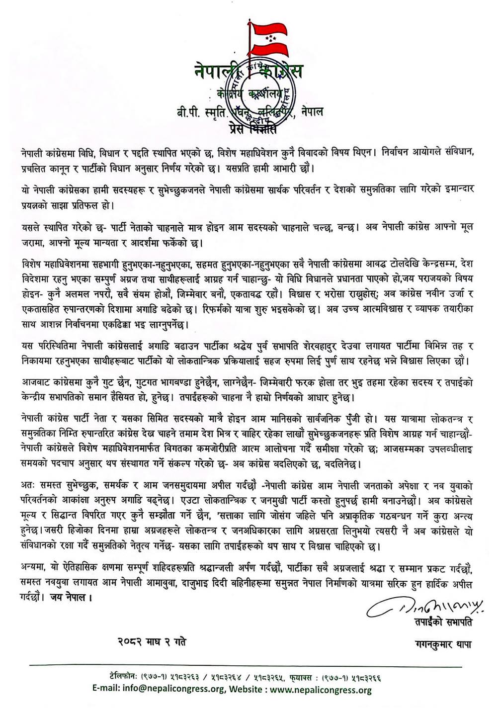 सभापति थापाले जारी गरेको प्रेस विज्ञप्तिमा नेपाली कांग्रेस अब कुनै एक नेताको चाहनाले होइन, आम सदस्यको चाहनाले चल्ने र बन्ने पार्टीका रूपमा स्थापित भएको उल्लेख छ । ‘नेपाली कांग्रेस आफ्नो मूल जरा, मूल्य–मान्यता र आदर्शमा फर्किएको छ,’ विज्ञप्तिमा भनिएको छ।