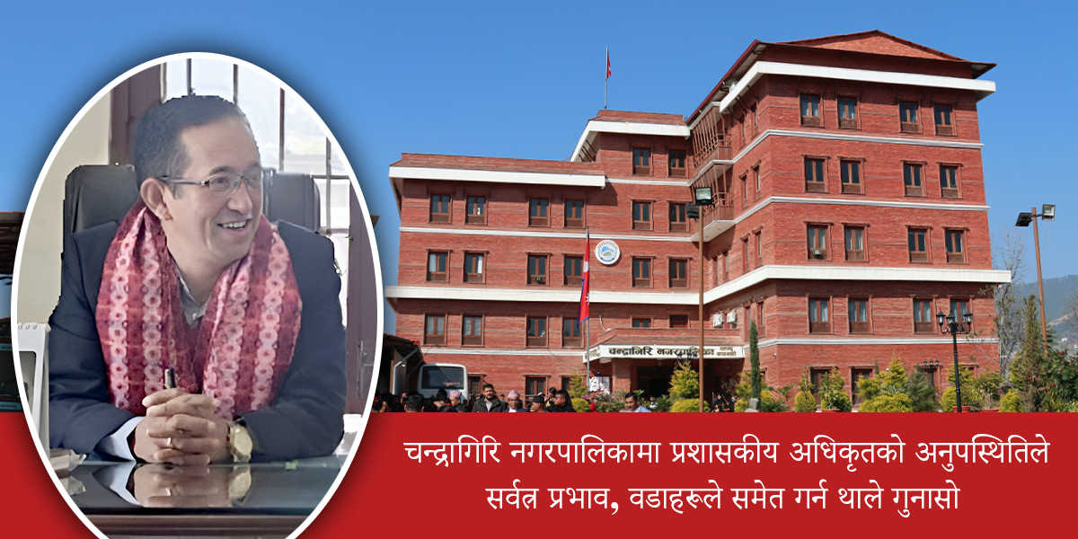 काठमाडाैं । चन्द्रागिरि नगरपालिकामा प्रमुख प्रशासकीय अधिकृतको अनुपस्थितिले नीतिगत तथा दैनिक कामकारबाहीमा प्रभाव पर्न थालेको छ भने उपभोक्ता समितिहरूले गरेका योजनाहरूको भुक्तानीमा समेत गम्भीर समस्या देखापरेको छ ।