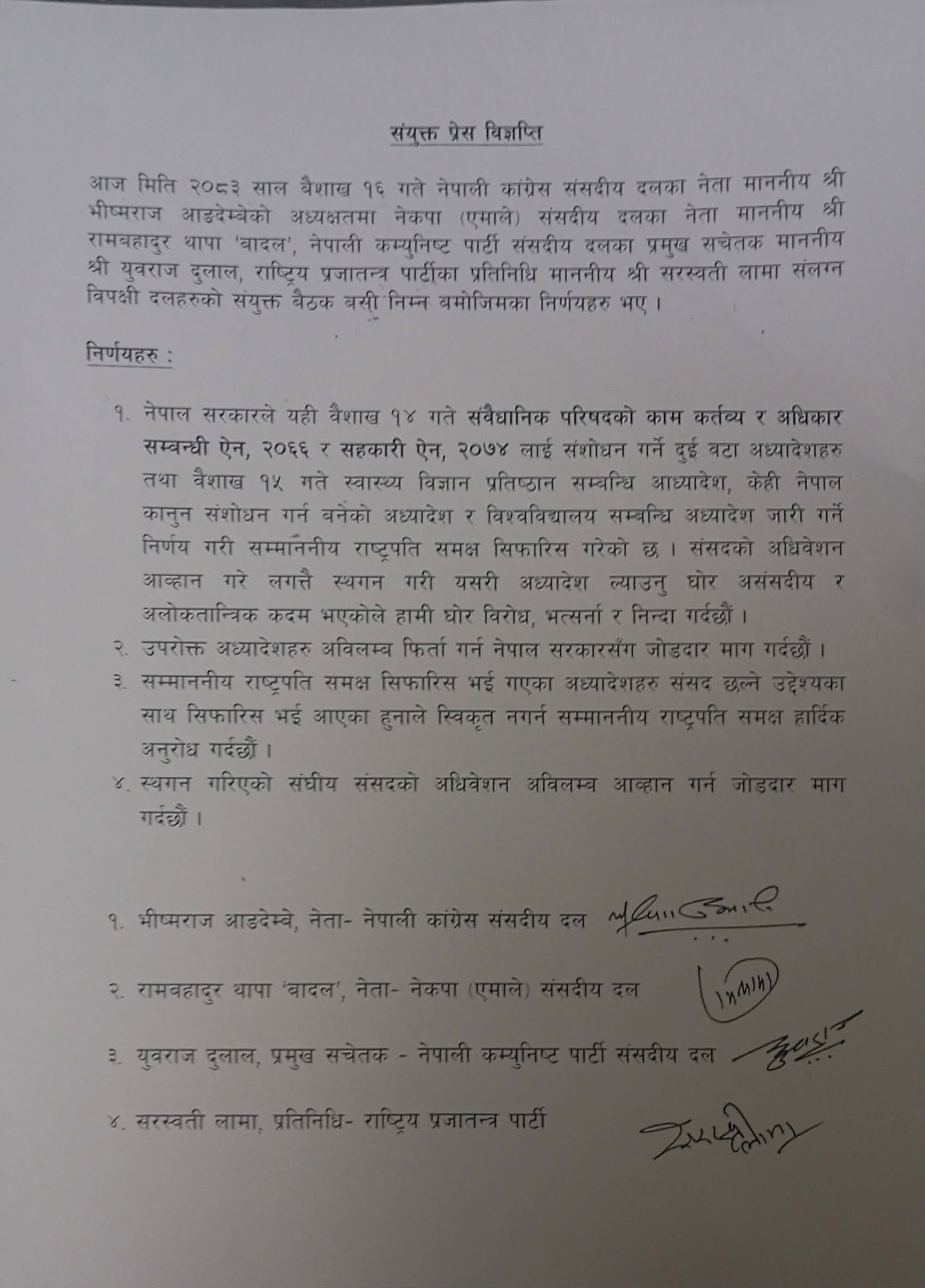 काठमाडौं । प्रमुख चार विपक्षी दलहरूले सरकारले पछिल्लो समय सिफारिस गरेका अध्यादेशहरूको विरोध गर्दै चार बुँदे माग अघि सारेका छन्।